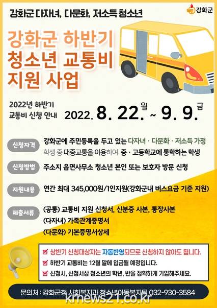 강화군이 저소득‧다자녀‧다문화 가정 중‧고등학생 교통비를 지원한다.