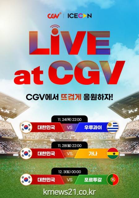 조진호 CGV 콘텐츠기획담당은 “2006년 독일 월드컵 이후 다섯 번째로 2022년 카타르 월드컵을 생중계하게 돼 기쁘다”며 “극장에서 한마음 한뜻으로 대한민국 대표팀을 소중한 분들과 함께 응원하며, 월드컵의 뜨거운 열기를 즐겨보길 바란다”고 말했다.