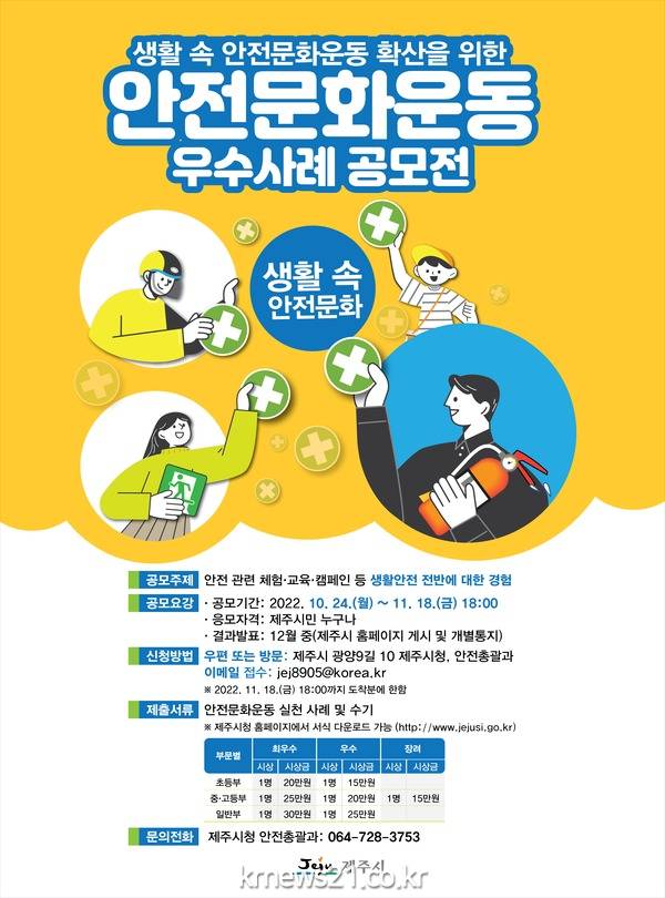 제주시 관계자는 “이번 공모전을 통해 생활 속 안전문화가 확산되고 공유될 수 있도록 시민들의 많은 관심과 적극적인 참여를 기대한다”고 밝혔다.