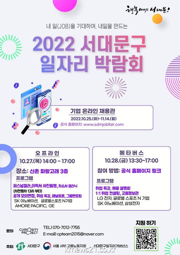 또한 10월 27일 오후 2∼5시에는 신촌 파랑고래 3층에서, 그 다음 날인 28일 오후 1시 30분∼5시에는 메타버스 사이트에서 취업 컨설팅이 열린다.