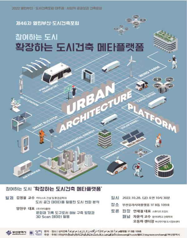 행사는 ▲김영철 카이스트 건설 및 환경공학과 교수의 ‘도시 공간 데이터를 활용한 도시 변화 분석’, 양현우 ㈜아띠플랜 대표의 ‘문화재 기록 도구로서 BIM 구축 방향과 3D Scan 데이터 활용’ 발제 ▲차윤석 동아대학교 건축학과 교수, 오동하 부산연구원 도시정보센터장이 참여하는 전문가 토론 순으로 진행된다.