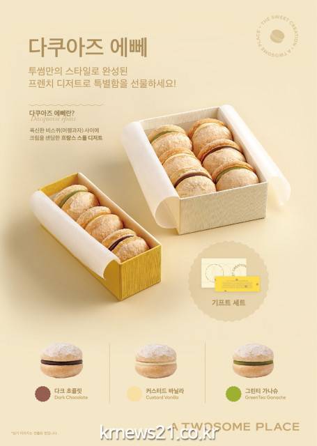 투썸플레이스 담당자는 “국내 소비자들의 취향과 선호에 대한 연구를 바탕으로, 마카롱에 이어 프랑스 정통 디저트 다쿠아즈를 투썸만의 스타일로 재해석한 새로운 스몰 디저트를 선보이게 됐다”며 “일상에서 가볍게 즐길 수 있는 다쿠아즈 에뻬를 전용 패키지에 담아 소중한 사람을 위한 센스 있는 선물로 활용해 보시길 추천 드린다”고 밝혔다.