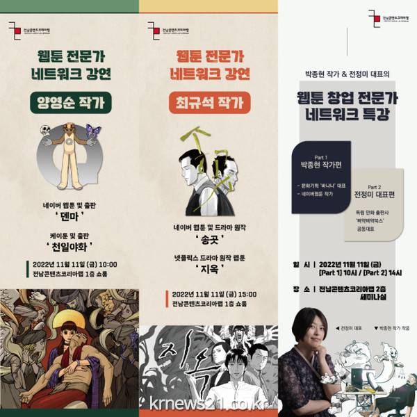 이번 웹툰 전문가 강연은 11월 11일 오전 10시부터 전남콘텐츠코리아랩에서 진행된다.