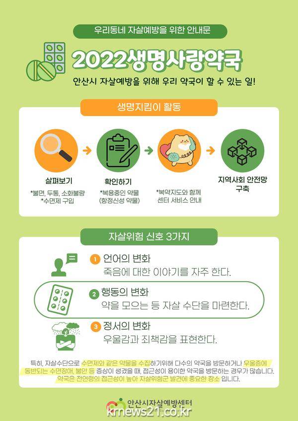 ▲ 사진=안산시자살예방센터 제공안산시(시장 이민근) 자살예방센터는 자살예방 안전망을 구축하고 자살고위험군 조기발견을 위해 관내 약국을 대상으로 ‘생명사랑약국’을 운영한다고 31일 밝혔다.