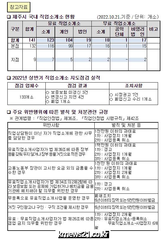 한편, 올 상반기에는 유·무료직업소개소 133개소 대상 지도점검 결과 총 8건의 위반사항을 확인하여 시정권고 7건, 폐업신고 수리 1건을 조치한 바 있다.