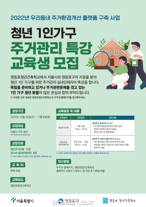 ▲ 사진=영등포구청 제공영등포구(구청장 최호권)가 영등포청년건축학교(이하 건축학교)에서 청년 1인 가구를 위한 ‘청년 주거관리 특강’을 진행한다고 밝혔다.