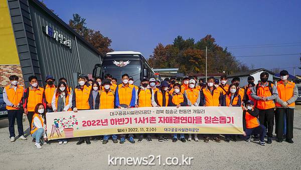 올해로 13년째를 맞이하는 대구공공시설관리공단과 청송군 현동면 개일리 마을의 1사1촌 자매결연은 매년 사과 적과와 수확 등 농번기 농가 일손 돕기, 사과, 사과즙 등 농산물 공동구매, 농민을 초청한 공단 시설 체험 행사 등을 꾸준히 이어오며, 도농화합과 지역상생에 기여해왔다.