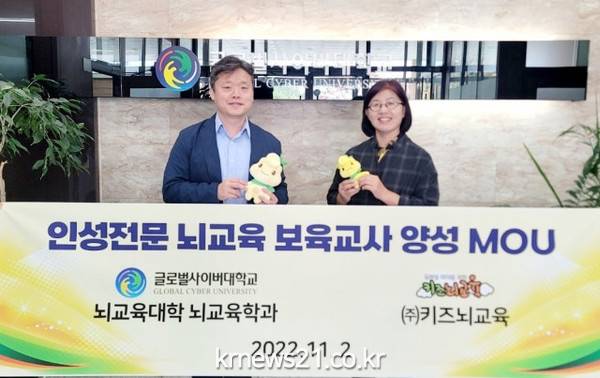 글로벌사이버대학교는 2일 글로벌사이버대학교 천안 본교에서 뇌교육대학 소속 뇌교육학과가 영유아 뇌교육 전문 기업 키즈뇌교육과 상호 간 산학 협력 MOU를 체결했다고 3일 밝혔다. 협약식에는 뇌교육학과 장래혁 학과장과 키즈뇌교육 임윤희 이사 및 담당자들이 참여했다.