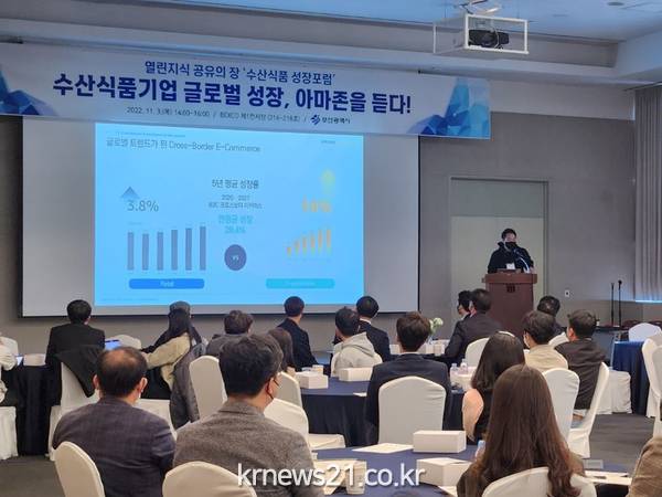 특히, 이날 특강에는 부산의 수산식품업계 관계자 100여 명이 참석해 온라인 판매 플랫폼 입점 방법과 판매 전략 등을 구체적으로 물어보는 등 해외 진출 노하우를 얻기 위한 관련 업계의 관심과 반응이 매우 뜨거웠다.