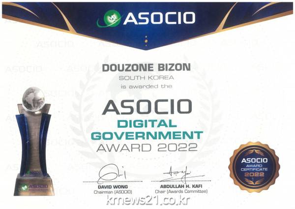ASOCIO는 2016년부터 매년 회원국 가운데 ICT 혁신과 발전에 기여한 기업 및 기관을 선정, 4개 부문에 시상하고 있다. 더존비즈온은 강원도 디지털 통합 행정 플랫폼인 ‘우리도’의 개발·서비스를 통해 대국민 공공 서비스의 질을 향상하고, 공공 복지·행정의 맞춤형 서비스 확산에 기여한 점을 인정받아 Digital Government 부문상을 수상했다.