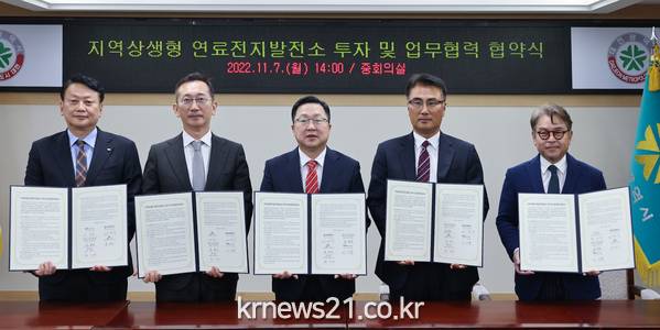 ▲ 사진=대전광역시대전시는 7일 대전시청에서 SK가스㈜, LS일렉트릭㈜, CNCITY에너지㈜, 주민 추진위원회와 ‘지역상생형 연료전지발전소’ 투자 및 업무 협력 협약을 체결했다고 밝혔다.