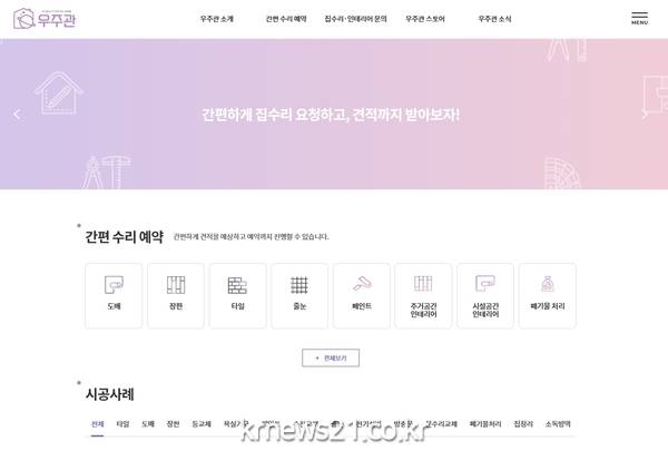 이번에 개설된 우주관 홈페이지는 크게 △우주관 소개 △간편 수리 예약 △집수리‧인테리어 문의 △우주관 스토어 △우주관 소식 등으로 구성되어 있다.