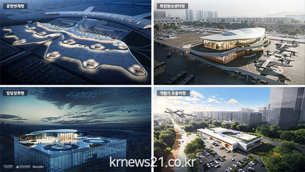 현대건설은 버티포트 운용 효율성과 입지 특성 등을 고려해 앞으로 도래할 한국 도심 버티포트 유형을 △공항연계형 △빌딩상부형 △복합환승센터형 △개활지 모듈러형 등 총 4가지로 구분해 기존 공항터미널 인프라와 도심 건축물 옥상부, 버스터미널 상부, 강변 및 막힘없이 트인 넓은 지형 등을 활용한 각 유형에 대한 개념 설계안을 제시했다.