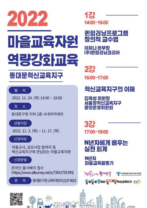 ‘마을교육자원 역량강화 워크숍’은 24일 오후 2시부터 동대문구청 지하 2층 사내아카데미에서 진행되며, 수강료는 무료다. 강의의 주요 내용은 ▲퀀텀러닝프로그램의 창의적 교수법 ▲혁신교육지구의 이해 ▲N년차에게 배우는 실전 회계 등이다.