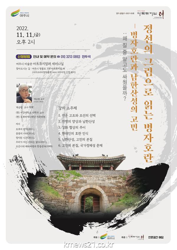 ▲ 사진= ‘정선의 그림으로 읽는 병자호란’ 세미나 포스터여주시(시장 이충우) 미술관 「아트뮤지엄 려」에서는 11월 11일 금요일 오후 2시 체험교육실(세미나실)에서 ‘정선의 그림으로 읽는 병자호란 – 병자호란과 남한산성의 고민’을 주제로 「아트뮤지엄 려」와 「인문공간 여담」이 공동주관 하여 세미나를 개최한다.