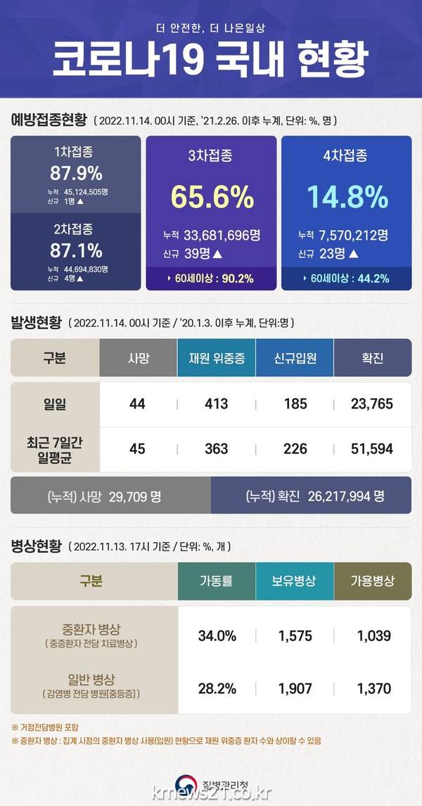 ▲ 사진=대한민국 질병관리청 페이스북오늘(14일)부터 오미크론 변이 BA4,5 기반 개량 백신 추가 접종이 시작된 가운데, 정기석 코로나19 특별대응단장 겸 국가감염병위기대응자문위원장은 동절기 추가 접종 필요성을 재차 강조했다.