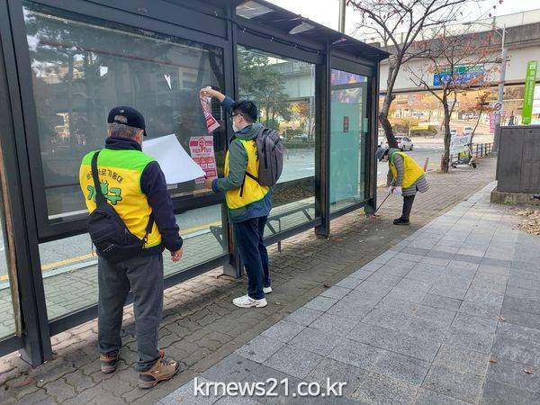 ▲ 사진=바로바로기동대가 동백역 인근 버스정류장에서 광고물을 수거하고 있다.용인특례시 기흥구가 희망드림 일자리사업과 연계, 시민 생활불편을 해결하기 위해 운영 중인 바로바로 기동대가 눈길을 끌고 있다.