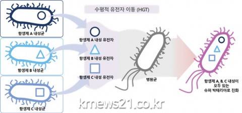 따라서 각기 다른 항생제에 저항성이 있는 박테리아가 항생제 저항성 인자를 병원균에 전달, 항생제 다중 내성을 보유한 슈퍼 박테리아로의 진화를 도울 수 있는 것이다(그림 참조). 이런 이유로 2019년 식품의약품안전처는 항생제 내성 유전자를 다른 박테리아로 전달할 가능성이 있는 일부 프로바이오틱스 균주의 사용을 금지한 바 있다.