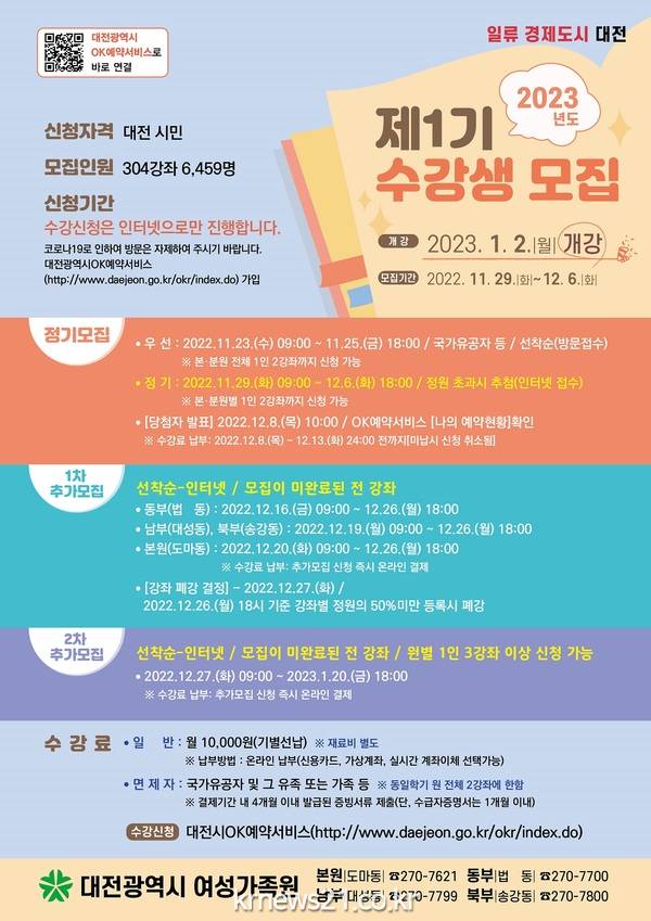 대전시민 누구나 신청할 수 있으며, 접수는 대전시 홈페이지 오케이(OK)예약서비스(www.daejeon.go.kr/okr/index.do)에서 1인 2강좌까지 가능하다. 정원을 초과할 경우 추첨을 통해 대상자를 선정하며, 선정 결과는 오는 12월 8일 OK예약서비스에서 확인할 수 있다.