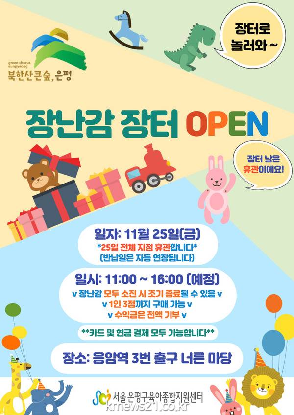 은평구가 운영하는 장난감나라 5곳에서 보유한 5년 이상 된 중고 장난감을 판매하고 수익금 전액은 모두 ‘따뜻한 겨울나기’ 성금으로 기부하는 나눔 행사다.