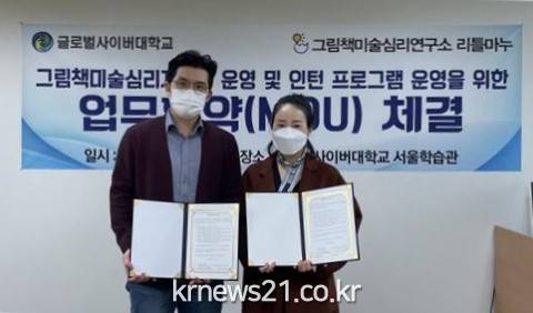 ▲ 사진=글로벌사이버대학교글로벌사이버대학교(총장 이승헌) 상담심리학과는 21일 그림책미술심리연구소 리틀마누(대표 신지원)와 그림책미술심리상담사 자격증 운영 및 인턴 프로그램 운영을 위한 업무협약을 체결했다고 밝혔다.