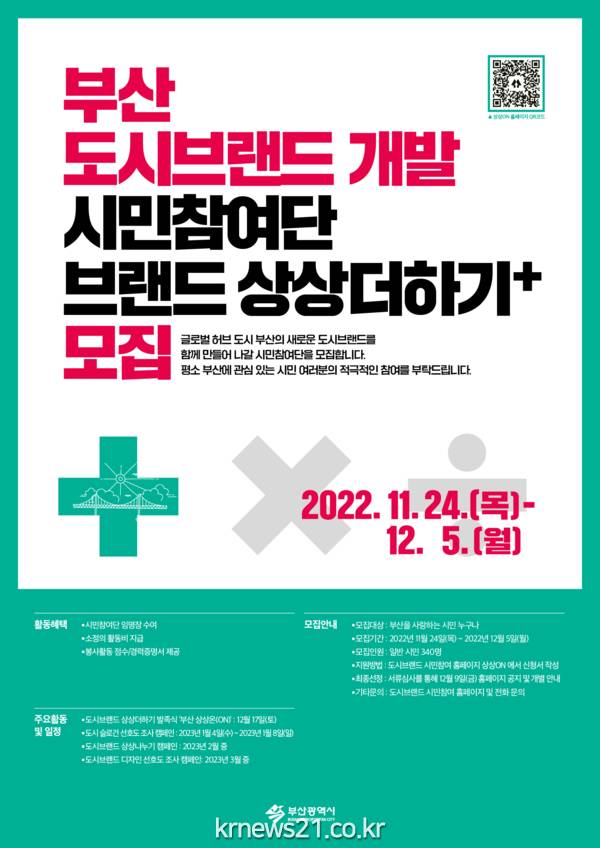 도시브랜드 새단장(리뉴얼) 과정에 부산시민의 대표성, 상징성을 더할 ‘브랜드 상상더하기+’는 오는 12월부터 2023년 3월까지 약 4개월간 활동하며, 선발규모는 340만 부산시민을 상징하는 340명으로 구성된다.