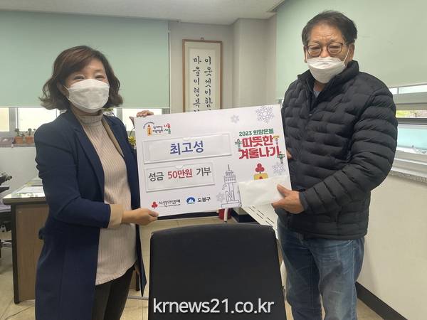 도봉구(구청장 오언석) 쌍문4동은 11월 17일 중국 음식점 ‘최고성’ 정동원 대표로부터 성금 50만 원을 기부받았다.