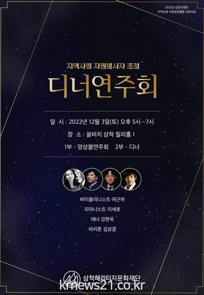 ▲ 사진=삼척시(재)삼척헤리티지문화재단이 오는 12월 3일(토) 오후 5시 쏠비치 삼척 릴리홀Ⅰ에서 「지역사회 자원봉사자 초청 디너연주회」를 진행한다.