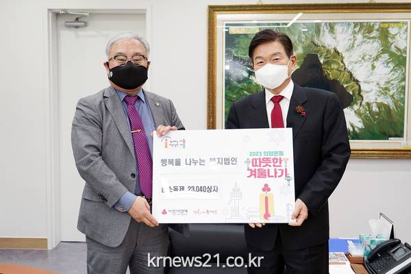 ▲ 사진=이필형 동대문구청장(사진 오른쪽)이 행복을 나누는 복지법인 홍승철 대표이사(사진 왼쪽)와 기념 촬영을 하고 있다.동대문구(구청장 이필형)는 7일 오전 11시 행복을 나누는 복지법인(대표이사 홍승철)에서 휴대용 손세정젤 23,040상자(1상자 당 휴대용 20개)를 기탁했다고 밝혔다.