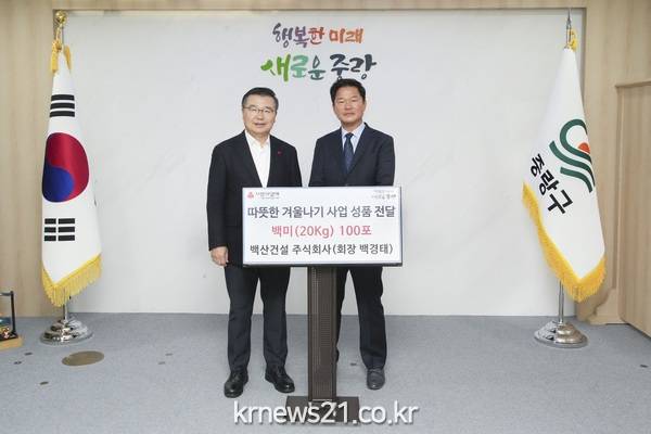 중랑구(구청장 류경기)가 지난 9일 백산건설 주식회사로부터 1천만 원 상당의 따뜻한 겨울나기 성금과 성품을 전달받았다고 밝혔다.