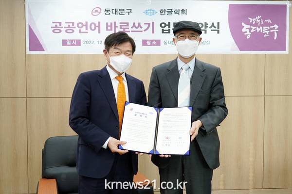 이필형 동대문구청장은 “이번 한글학회와의 공공언어 바로쓰기 업무협약으로 공공언어를 쉽고 바르게 사용함으로써 주민과의 소통을 강화하고 아울러 구민의 올바른 국어사용을 위해 힘쓰겠다”라고 말했다.