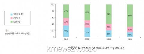 부모의 소득분위가 높아질수록 자녀가 일반대학에 재학하는 비중은 증가하고 대학 미진학자 비중은 감소했다.