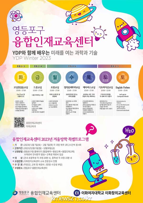 구는 ‘YDP와 함께 미래를 여는 과학과 기술’을 주제로 내년 1월 7일부터 4주 동안 ‘2023 겨울방학 특별프로그램’을 융합인재교육센터에서 진행한다고 밝혔다.