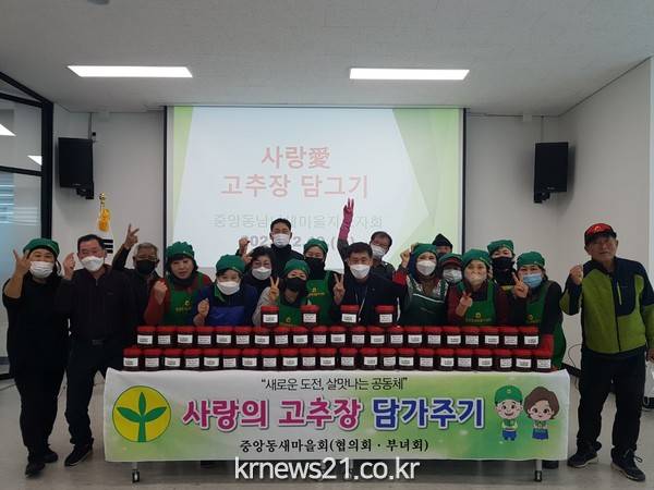 이날, 김충화 중앙동새마을지도자협의회장, 길경숙 중앙동새마을부녀회장을 비롯해서 중앙동남녀새마을지도자 10여명이 참여해 각 24개 마을 이웃들에게 고추장(2kg) 100여통을 전달했다.