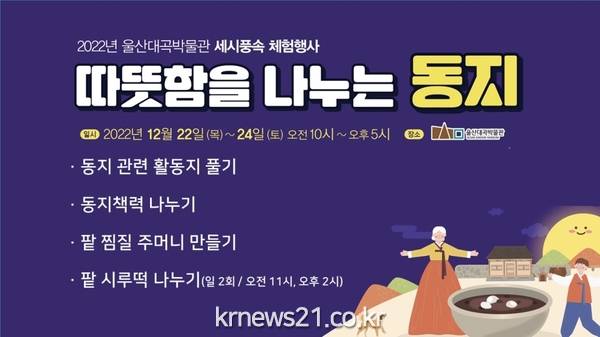 ▲ 사진=울산광역시울산대곡박물관은 동지를 맞아 12월 22일부터 12월 24일까지 3일간 2022년 동지 세시풍속 체험행사 ‘따뜻함을 나누는 동지’를 마련한다고 밝혔다.