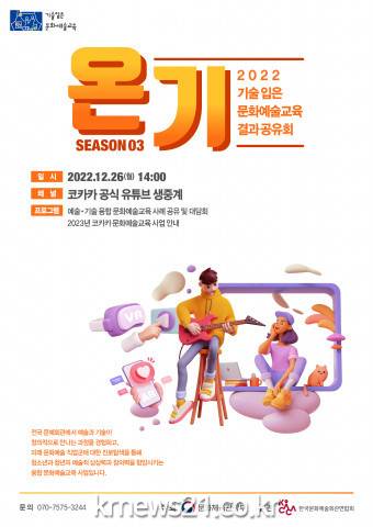 ▲ 사진=한국문화예술회관연합회문화체육관광부(장관 박보균)가 주최하고 한국문화예술회관연합회(회장 이승정, 이하 코카카)가 주관하는 ‘문화예술 직업체험 교육프로그램 지원’ 사업(이하 기술 입은 문화예술교육) 결과공유회 ‘온기’ 시즌3가 12월 26일(월) 오후 2시에 온라인으로 개최된다.