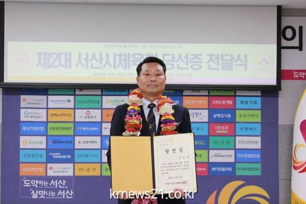 충남 서산시는 서산시체육회장 선출 선거운영위원회에서 22일 ‘제2대 서산시체육회장선거’에 단독 출마한 윤만형 서산시체육회 현수석부회장에게 ‘제2대 서산시 체육회장 당선증’을 교부했다고 밝혔다.