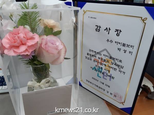 많은 사연들 중 주인공으로 선정된 박성미 돌보미는 올해의 우수활동가로 뽑힐 만큼 활발하고 적극적으로 연계 가정의 양육을 도와왔다. 지난 22일 센터를 통해 영상편지와 꽃다발, 감사장을 전달받은 박성미 돌보미는 “따뜻한 마음과 응원의 메시지 덕분에 큰 용기를 얻게 됐다”라며 “아이와 가족을 위해 진심을 다하는 돌보미가 되도록 더욱 노력하겠다”라고 소감을 밝혔다.