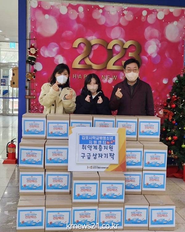 (재)김포시청소년재단(이사장 김병수) 학교밖청소년지원센터(이하 꿈드림)는 지난 12월 21일 꿈드림 ‘봉사활동’ 프로그램 일환으로 학교 밖 청소년들이 준비ㆍ제작한 구급상자를 기부하기 위해 김포시종합사회복지관과 기탁식을 진행했다. 구급상자는 지역사회 내 취약계층 어르신과 청소년들에게 전달 될 예정이다.
