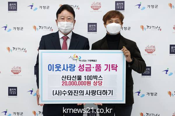 한편, (사)수와진의 사랑더하기는 지난해에도 산타 선물 100세트를 기탁하는 등 2년 연속 가평군에 따뜻한 이웃사랑을 이어오고 있고, 2022년 10월 20일에 수와진은 가평군 홍보대사로 위촉된바 있다.