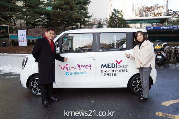 ▲ 사진=이필형 동대문구청장(사진 오른쪽)과 이미화 한국건강관리협회 동부지부 본부장(사진 왼쪽)이 기념 촬영을 하고 있다.동대문구(구청장 이필형) 보건소가 ‘장애인 특화차량 지원사업’ 공모에 선정돼 29일 오전 10시 기탁식을 개최했다.