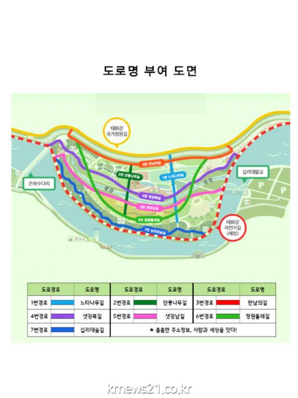 주요 사업 내용을 보면, 울산시는 도로명이 없던 태화강 국가정원 주요 보행로 7개 구간에 느티나무길, 정원둘레길, 샛강북길, 샛강남길, 단풍나무길, 십리대숲길, 만남의길의 ‘도로명’을 새롭게 부여했다.
