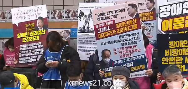 이들은 기자회견을 통해 이른바 '장애인권리예산'이 올 해 예산안에 0.8%만 반영됐다며, 예산 증액을 요구했다.