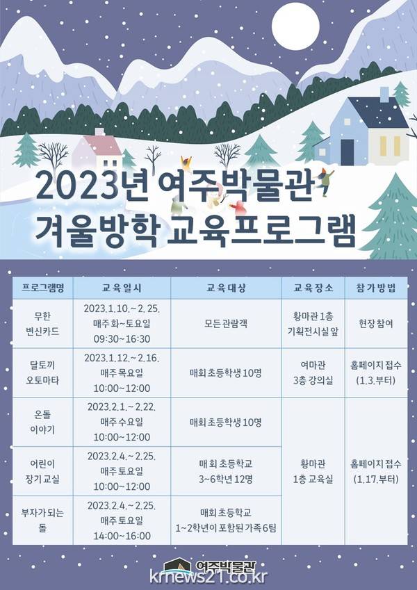 여주시(시장 이충우) 여주박물관에서는 2023년 겨울방학을 맞이하여 전시 및 교육, 문화 프로그램 등 다채로운 즐길거리를 마련했다.