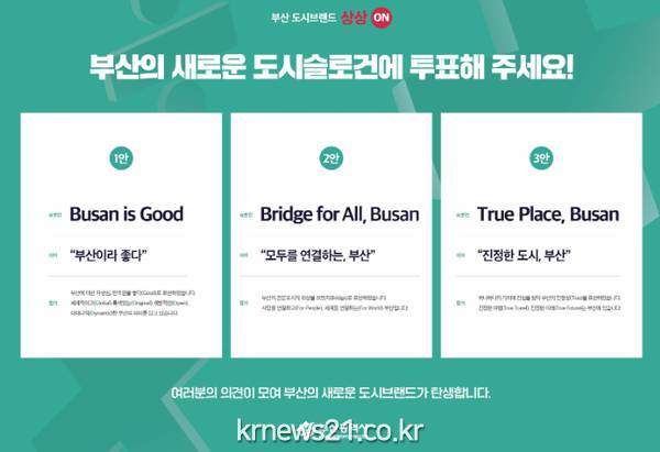 부산의 새로운 얼굴이 될 도시 슬로건 최종후보는 ▲Busan is Good(부산이라 좋다) ▲Bridge for All, Busan(모두를 연결하는, 부산) ▲True Place, Busan(진정한 도시, 부산)이다.
