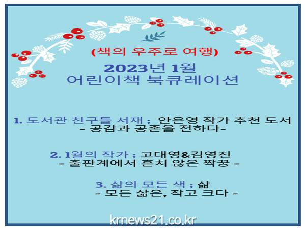 2023년 어린이책 북큐레이션은 전 세대가 읽을 수 있는 그림책을 중심으로 ▲도서관 친구들 서재 ▲이달의 그림책 작가 ▲삶의 모든 색 등 3개 코너로 진행된다.