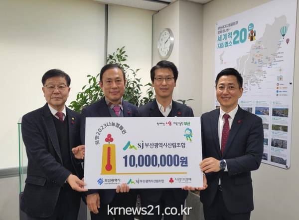 ▲ 사진=부산광역시부산시(시장 박형준)는 부산시 산림조합(조합장 이상기)이 어제(5일) 오후 2시 시청 22층 회의실에서 부산사회복지공동모금회(회장 최금식, 이하 ‘부산사랑의열매’)로 희망2023나눔캠페인 이웃사랑 성금 1,000만 원을 전달했다고 밝혔다.