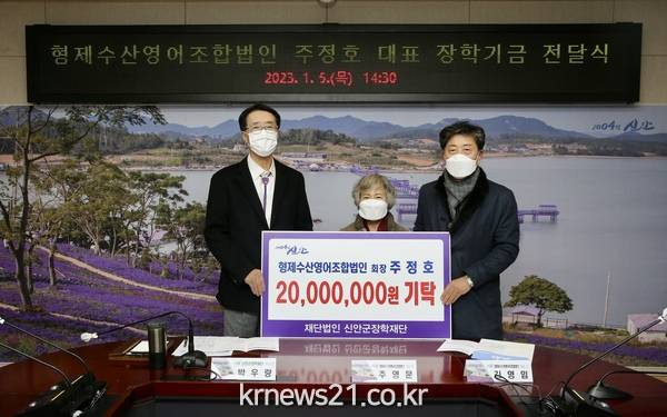 ‘형제수산영어조합법인 주정호 대표’는 5일 신안군청을 방문해 신안군의 학생들을 위해 써달라며 장학기금 2천만원을 (재)신안군장학재단(이사장 박우량)에 약정했다.