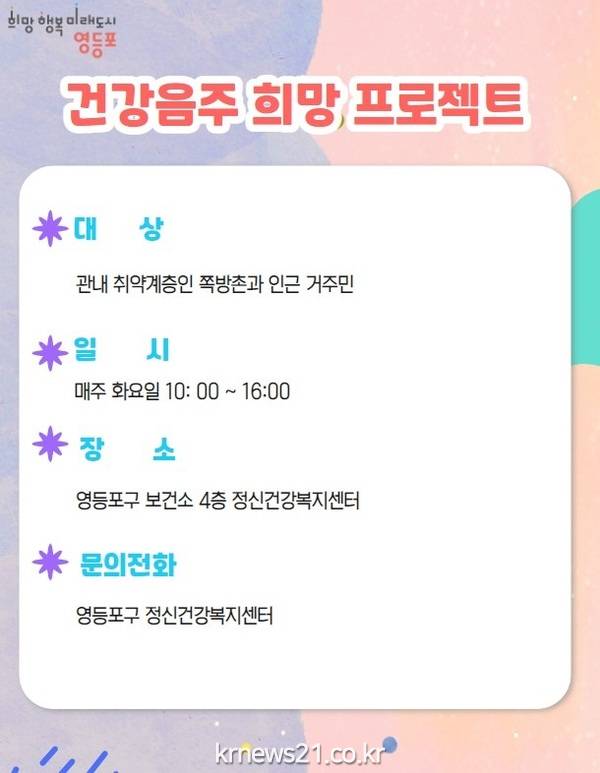 건강음주 희망프로젝트는 영등포구 보건소 4층 정신건강복지센터에서 매주 화요일 10시부터 16시까지 진행하고 있다. 그 밖에 신청과 관련된 사항은 정신건강복지센터로 문의하면 된다.