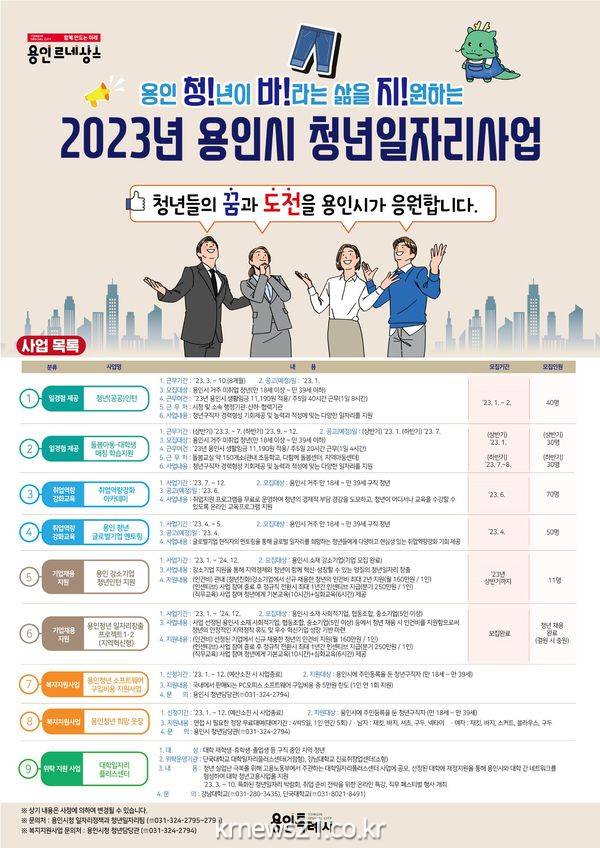 ▲ 사진=용인특례시 청년 일자리 지원 사업 안내 포스터용인특례시(시장 이상일)는 청년 일자리와 관련해 ▲일 경험 제공 ▲취업역량 강화교육 ▲기업채용 지원 ▲복지지원사업 ▲위탁지원 등 5개 분야 맞춤형 지원에 나선다고 10일 밝혔다.